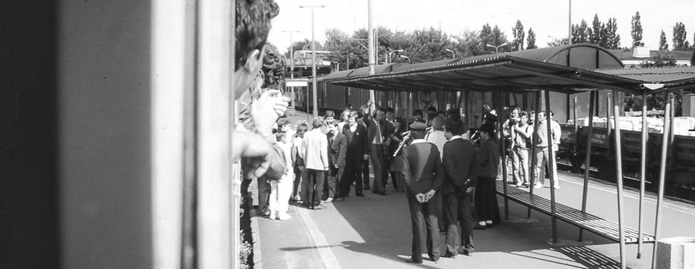 À Helmstedt, dernière station avant la frontière qui sépare les deux Allemagnes. La halte se prolonge. Chacun se défoule aidé par le Théâtre de l’Unité, sa fanfare qui anime chaque arrêt de train.